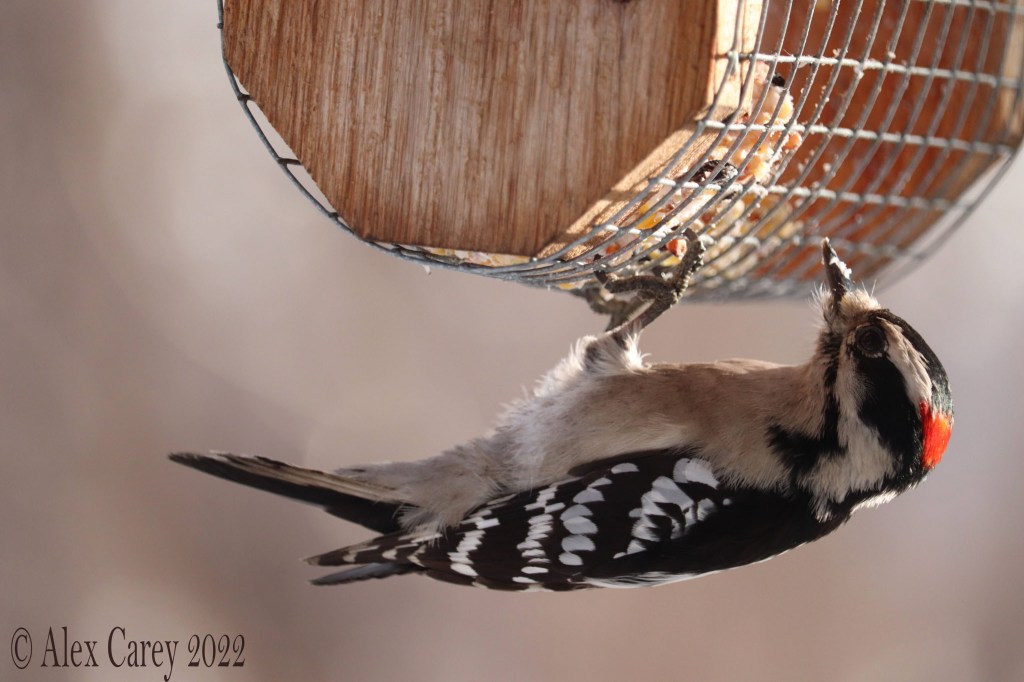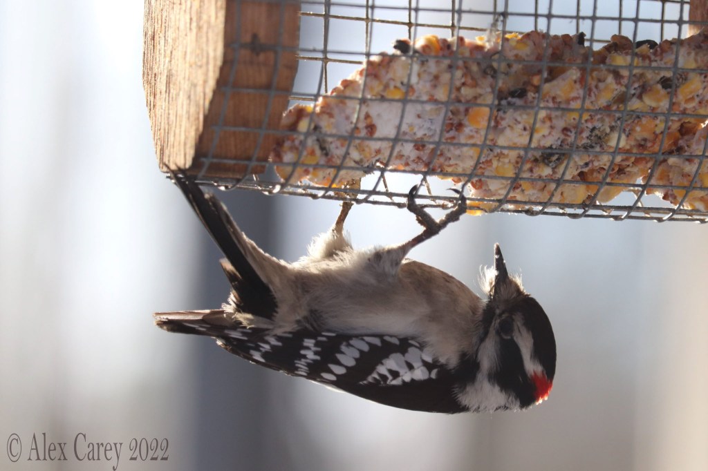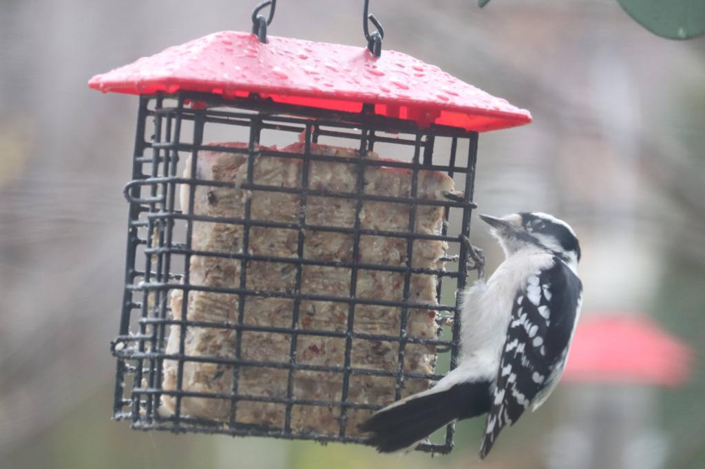I got some pictures of the Downy Woodpecker pecking at the suet feeder.
