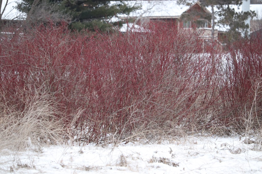 This is called a red twig dogwood bush. They stand out in the winter time.