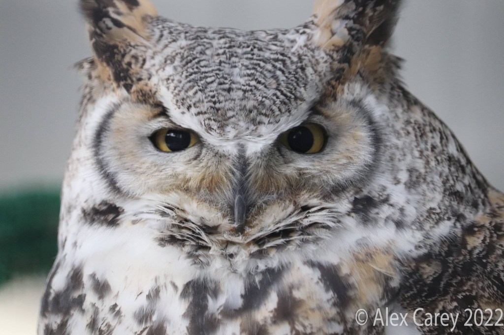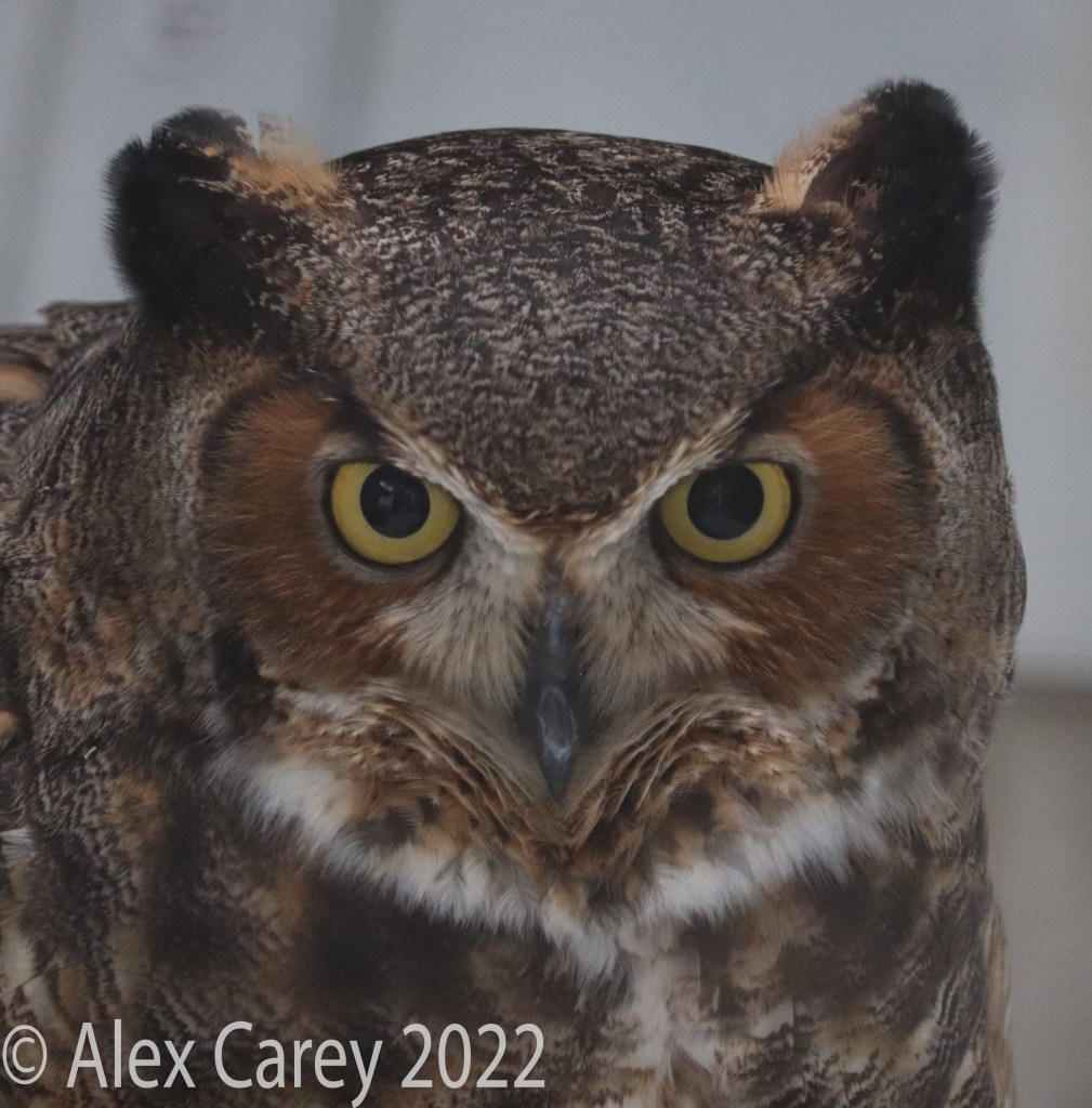 They had two Great Horned owls there, which was amazing to see. The Great Horned is the largest owl in North America. The horns on the Great Horned owl are not really horns at all, they are actually just tufts. Great Horned Owls aren’t all the same color and size.